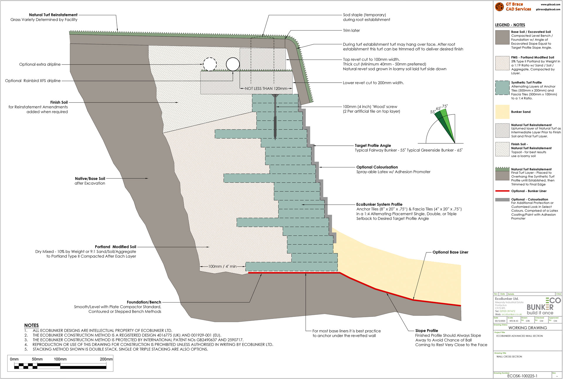 EcoBunker Advanced is not a gravity structure. It performs as a cantilever wall, which is known to all civil engineers as a more efficient method of construction. The diagram below shows a typical cross section through the wall. The tiles come in two sizes, narrower fascia tiles, and wider anchor tiles. The anchor tiles provide a structural link between the fascia and the cement modified soil backfill behind. Unlike the original gravity wall option, structural stability is provided through a combination of the synthetic tiles and the cement modified soil behind.